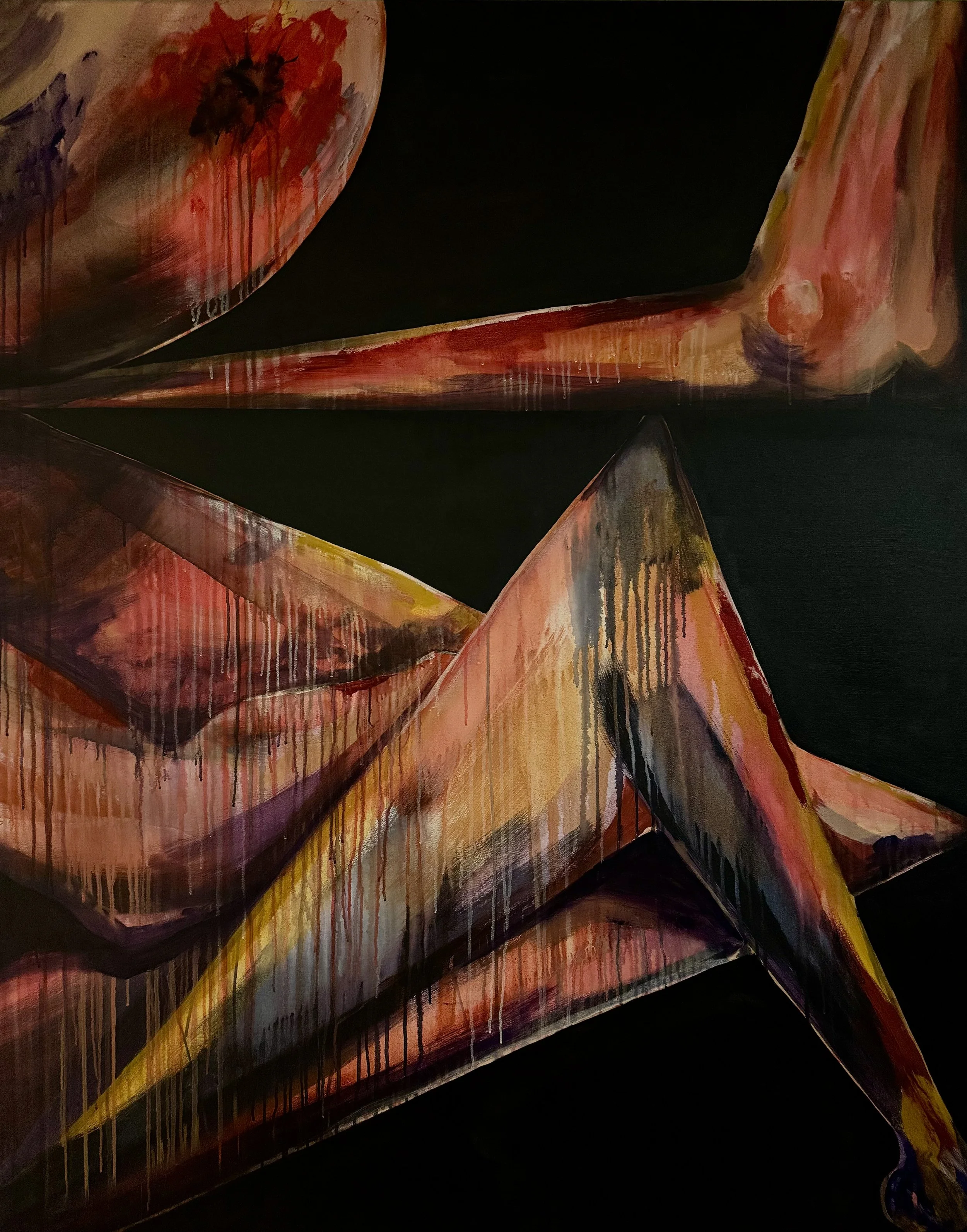 This piece depicts the figure in constraint of space. The sense of confinement and being trapped within the ever encroaching walls.